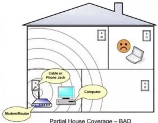 Wi-Fi signals travel as radio waves from the router. These waves spread out in all directions but lose strength as they move farther away. Walls, floors, and furniture can block or weaken the signals. Signals often get weaker when passing through thick walls or floors, especially in a two-story house.